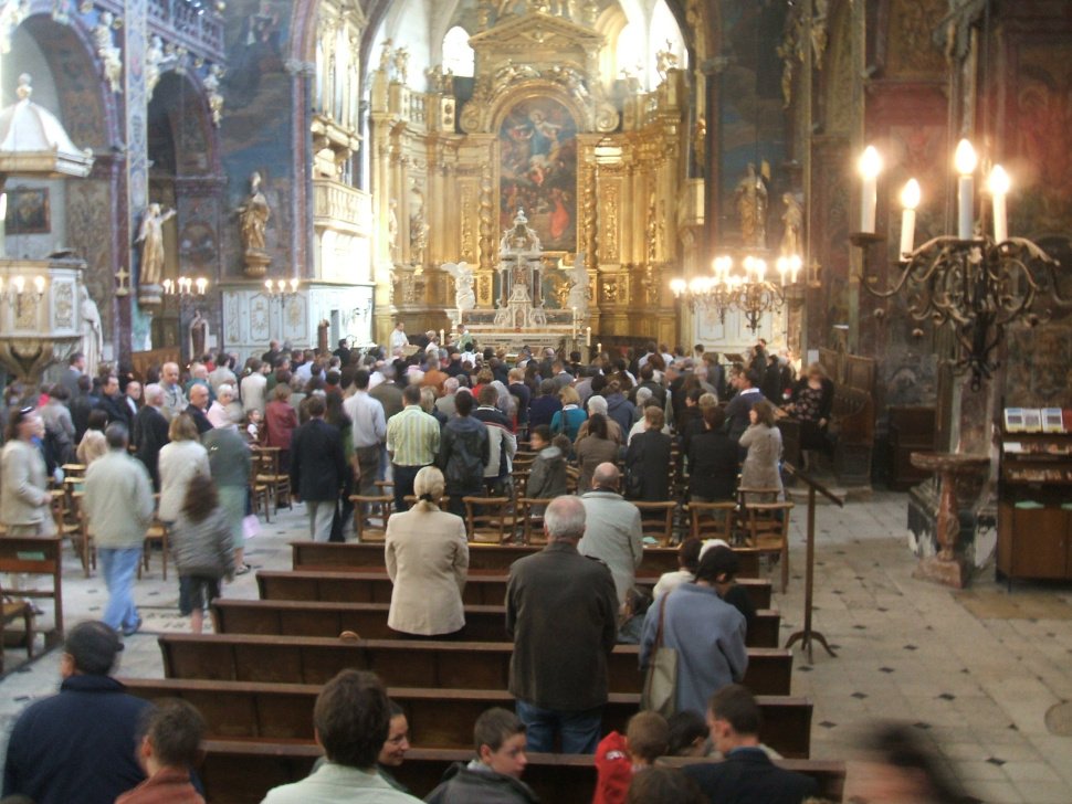 En entrant, on est surpris par les dorures, mais rapidement le regard se porte sur le chœur tourné vers l’Orient (une église est « orientée »), où les statues en bois doré de Saint Laurent patron de la paroisse, saint Pierre, saint Paul, et saint Pancrace encadrent le tableau de l’assomption de Marie peint par Reynaud Levieux en 1630.