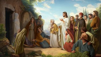 Jésus pleure en constatant la détresse de ses amies, Marthe et Marie, et de la foule venue pour les soutenir dans cette épreuve du deuil ; puis il demande à aller au tombeau de Lazare, l’ayant fait ouvrir malgré les réticences de la pragmatique Marthe, il rend grâce au Père qui l’exauce toujours. « Après cela, il cria d’une voix forte : ‘Lazare, viens dehors !’ » De cette façon, Jésus montre qu’il est la source de la Vie comme il vient de l’affirmer à Marthe.